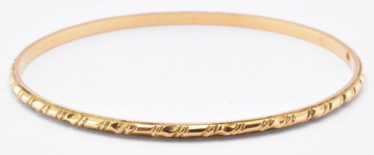 A yellow metal dowry bangle bracelet. The bangle having diamond cut decoration. Marked 22K. Tests indicate high carat gold. Weight 12.1g. Measures approx. 18.5cms internal circumference.