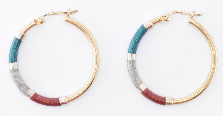 A pair of 9ct gold and enamel hoop earrings. The earrings being set in red, green and silver enamel to half of the hoop and 9ct gold to the other half. Marked 375 to the sleeper clasp. Diameter measures approximately 31mm.Total weight 2.92g.