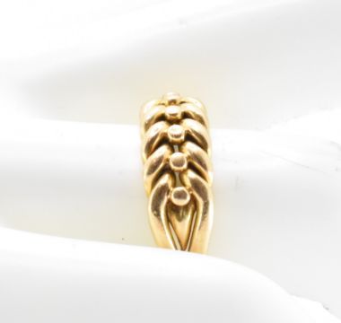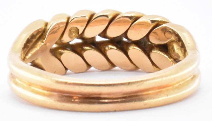 An early 20th Century Edwardian hallmarked 18ct gold keepers ring. The ring having a woven design head. Hallmarked London 1900, sponsors mark W.W. Weight 7g. Size N. Good condition.