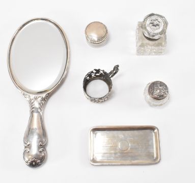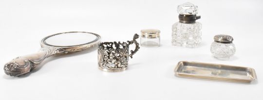 A collection of silver hallmarked dressing table items to include silver backed mirror with repousse cherub decoration, a silver pin tray with an unengraved round panel to the centre, two silver topped dressing table pots, and a pierced decoration repousse cup holder. Mirror hallmarked Chester 1899 and measures 26.5cm, pin tray hallmarked Birmingham 1918 and measures 11.5cm, pots hallmarked Birmingham 1917 and Chester 1904, cup holder hallmarked Birmingham 1904. Weight of lids, cup holder and pin tray 90.1g.