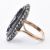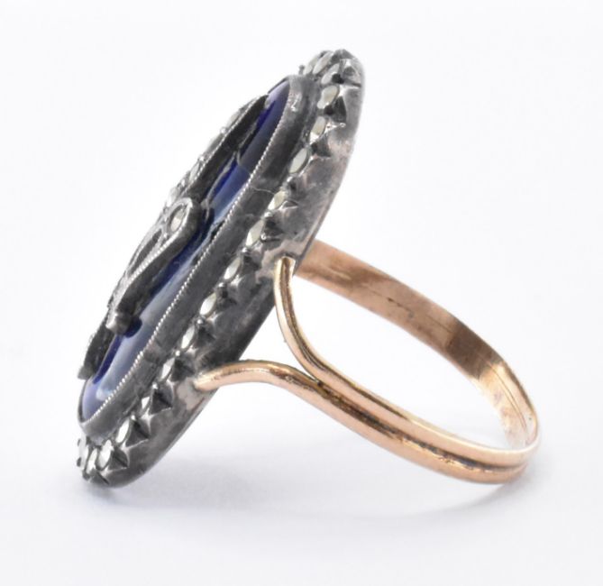 An early French 19th Century enamel 18ct gold and silver ring. The ring having a blue enamel head with blue  marcasite studded fleur de lys emblem having a marcasite halo to bifurcated reeded band.  French eagle and partial makers lozenge to outside of band. Head measures approx 2.5ms . Tests indicate 18ct gold & silver. Weight 4.8g. Size O.