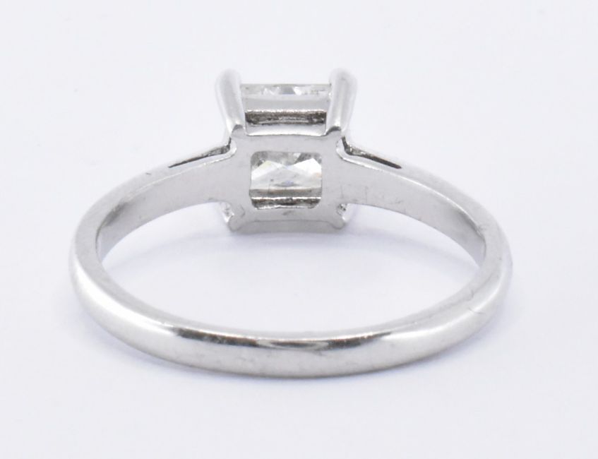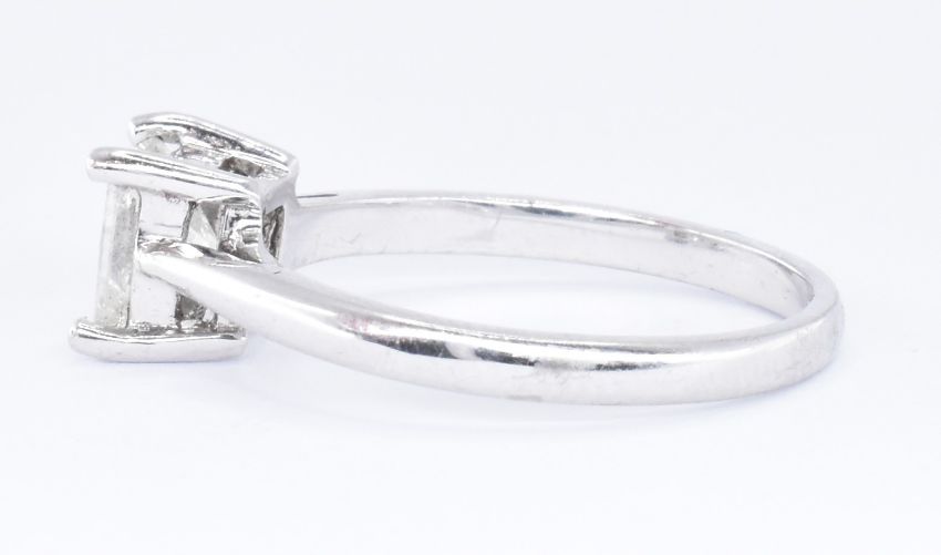 An 18ct white gold and diamond single stone ring. The ring being set with a princess cut diamond in a four prong setting. Tests indicate 18ct gold. Weight 3.1g. Size N. Diamond measures 5.3 x 5.3 x 3.4mm, estimated at 0.8ct.