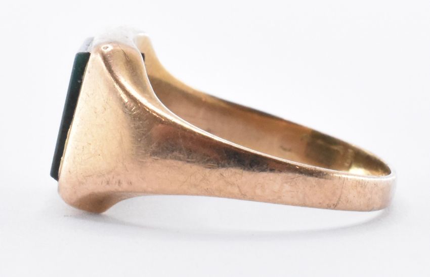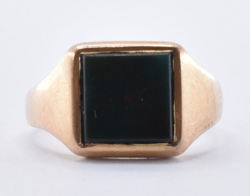 A 9ct gold and bloodstone agate signet ring. The ring having a square bloodstone panel set to the head and plain shank. Hallmarked rubbed, 9ct visible. Total weight 2.8g. Size I.5.