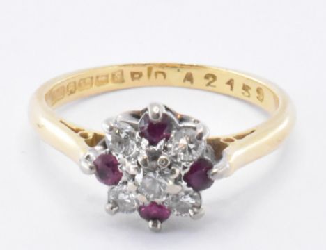 A hallmarked 18ct gold ruby and diamond cluster ring. The ring being set with five round cut diamonds and four round cut rubies. Hallmarked Birmingham 2017. Weight 2.9g. Size K. Central diamond measures 3mm diameter.