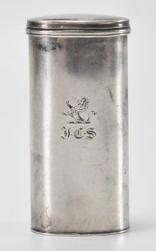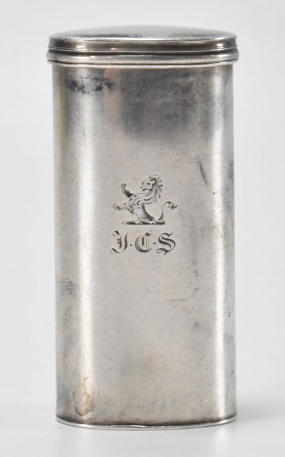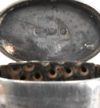 A 19th Century Victorian Joseph Willmore silver hallmarked nutmeg grater. The grater of cylindrical form with a hinged lid to the top opening to reveal a grater within. Engraved initials to the front. Hallmarked Birmingham 1840. Weight 34.9g. Measures 6.5cm tall.