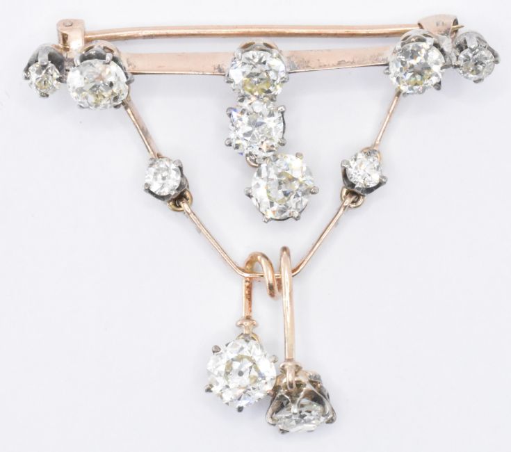 A 19th Century Victorian gold and diamond brooch. The brooch being set with eleven old cut diamonds. The brooch having a knife car set to the top with set with four diamonds, with a further seven suspended below. Diamonds estimated 4.30ct in total. Comes in a velvet fitted case with easel back. Weight 6.7g. Measures 4cm wide, and 3.8cm high.