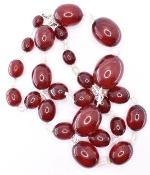 A vintage cherry bakelite beaded necklace having oval beads with alternate clear faceted beads. Measures 67cm. Weight 70.9g.