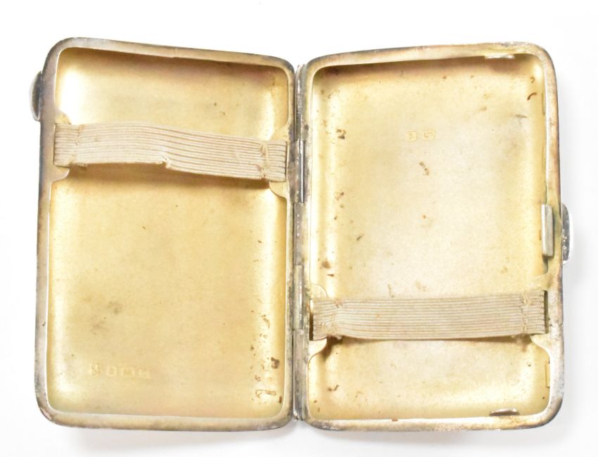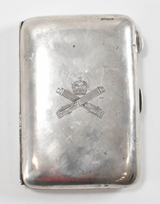 A hallmarked silver early 20th century cigarette case. The case having the WW1 British Machine Gun Corps emblem to the lid and original gilt interior. Hallmarked for Birmingham. Date letter t for 1918. Measures 85mm x 60mm x 15mm. Total weight 80g.