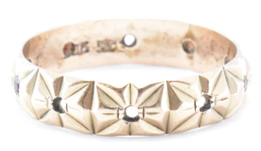 A 9ct gold band ring having incised decoration, set in some places with red stones. Marked 9ct to the band. Weight 2.6g. Size S. Stones missing.