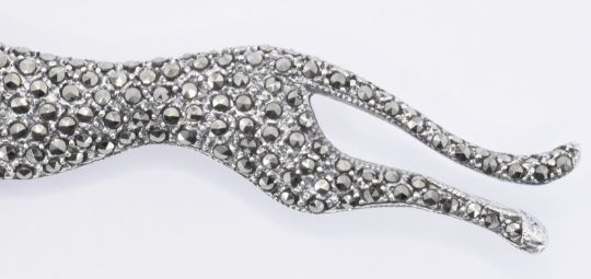 A silver and marcasite leopard brooch of stylised elongated from, set with marcasites throughout and with a turquoise panel collar. Measures 9cm wide. Weight 21.0g. Unmarked but tests indicate silver.