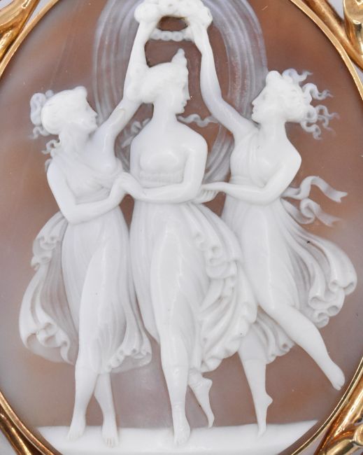A 19th Century Victorian gold and carved shell cameo brooch. The brooch having an oval cameo finely carved with the three graces within a knot design mount. Hinge pin and c clasp to verso. Tests indicate gold. Measures 6.5 x 5.5cm wide. Weight 21.0g.