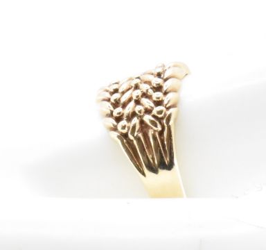 A hallmarked 9ct gold keepers ring having a woven design head. Hallmarked London 1987. Weight 4.36g. Size R.5.