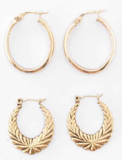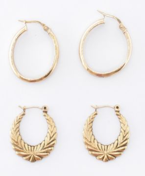 Two pairs of 9ct gold earrings to include an unmarked pair of creole hoop earrings with another pair marked 375 to the sleeper clasp. Creoles measure 20mm x 25mm. Stamped pair measure 22mm x 26mm. Total weight 2.36g.
