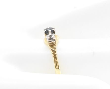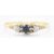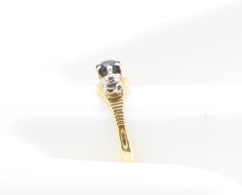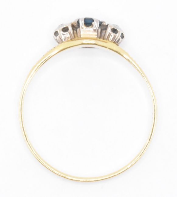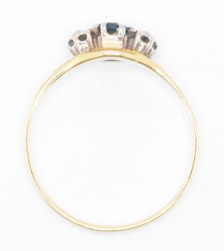 An 18ct gold three stone ring being set with a central round cut blue stone flanked by two round cut diamonds. Marked 18ct to the band. Weight 2.0g. Size P.5. Principle stone measures approx 3mm diameter.