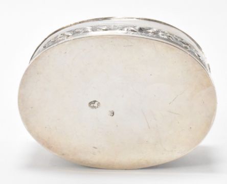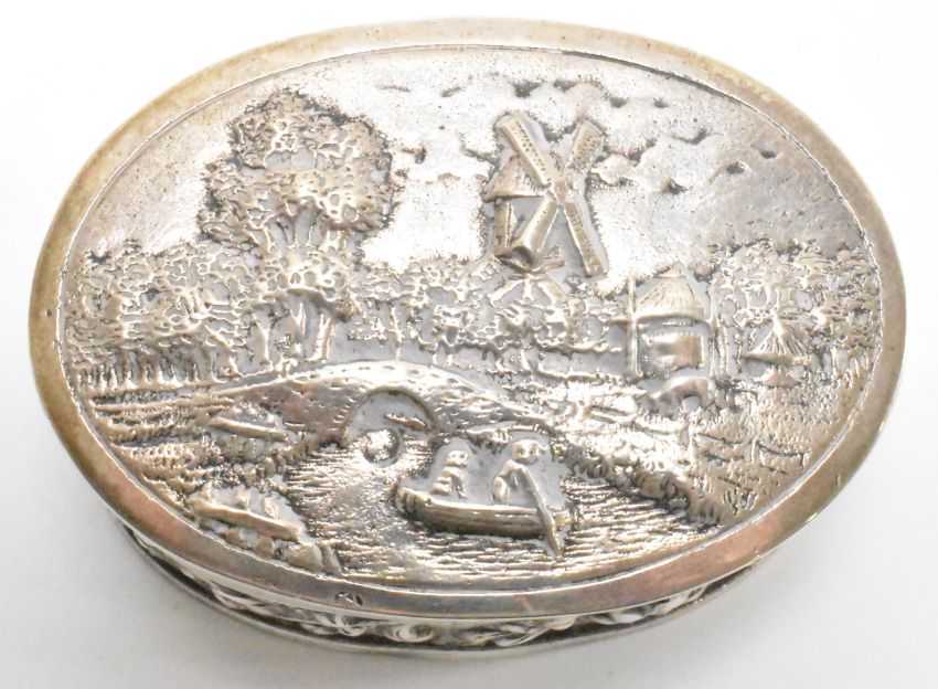 A 1920's Dutch silver trinket box of oval form having a moulded landscape scene with a windmill to the top, the sides being decorated with floral scrolls. Hallmarked with lion passant mark, and date letter for 1921. Measures 6.2cm wide. Weight 71g.