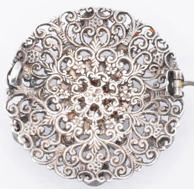 An early 20th Century silver, amethyst and mother of pearl brooch. The brooch of round form with pierced floral detailing set with seven round cut amethysts and six round mother of pearl panels. Hinge pin and C clasp to verso. Unmarked. Measures 4cm diameter. Principle stone measures 9.3mm diameter. Weight 18.8g.