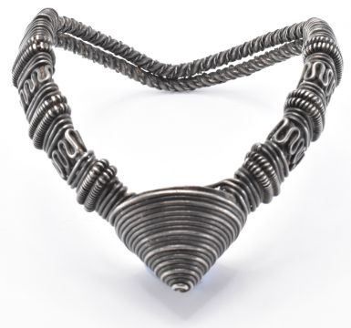 An Indian silver bajuband armlet having a rope twist band with wire work detailing and conical detailing to the head. Unmarked but tests indicate silver. Weight 111.15g. Circumference approx 22cm. Head measures 3cm diameter.