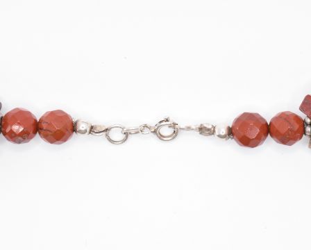 A four strand necklace threaded with rectangular polished stone beads with white metal spacer beads, all mounted to a silver spring ring clasp. Measures 19 inches.