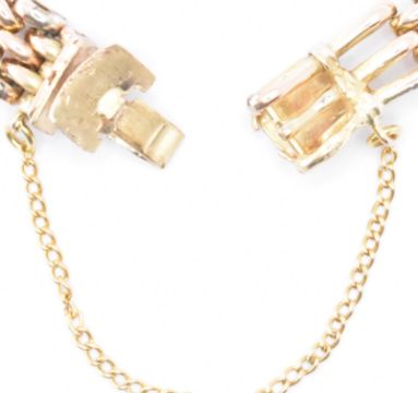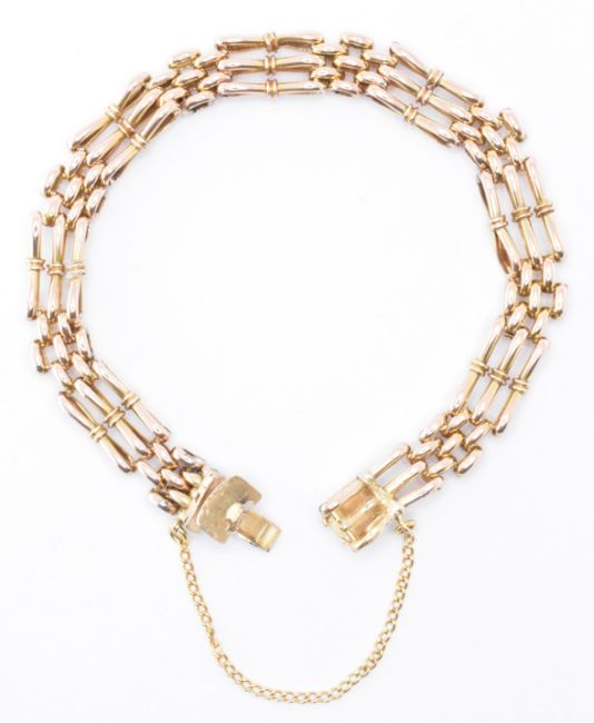 A 9ct gold gate link bracelet. The bracelet formed of a four bar gate link chain united by clasp having trace safety chain. Weight 11g. Measures 17cms.