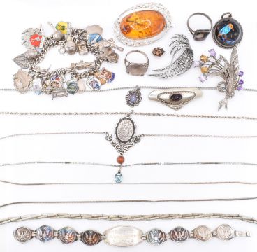 An assortment of 20th Century silver and white metal jewellery to include a silver charm bracelet with enamelled souvenir charms (7 inches), a silver panel bracelet having round links with bird motifs (7.5 inches), a silver collar necklace set with a red stone (16 inches), a rope twist necklace chain with a Victorian locket pendant (18 inches), a silver arts and crafts brooch set with a purple stone cabochon (4.5cm wide), a Victorian silver coin ring (size O), a butterfly wing set silver pendant and ring (2.6cm), a silver and marcasite brooch (measures 4.5cm), silver necklace chains, a white metal and amber brooch. Silver weight 122.1g.