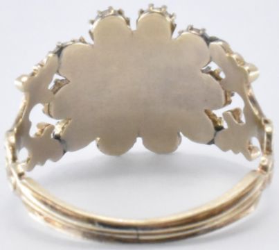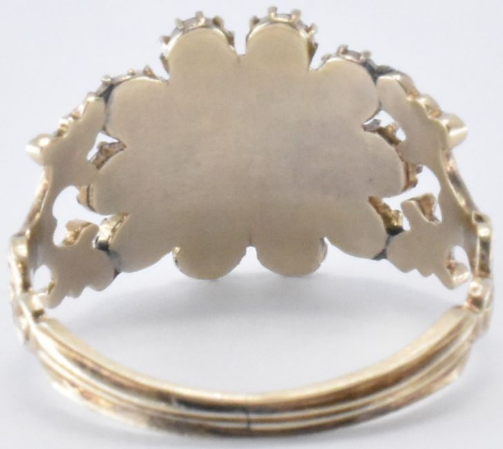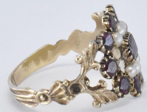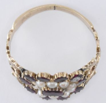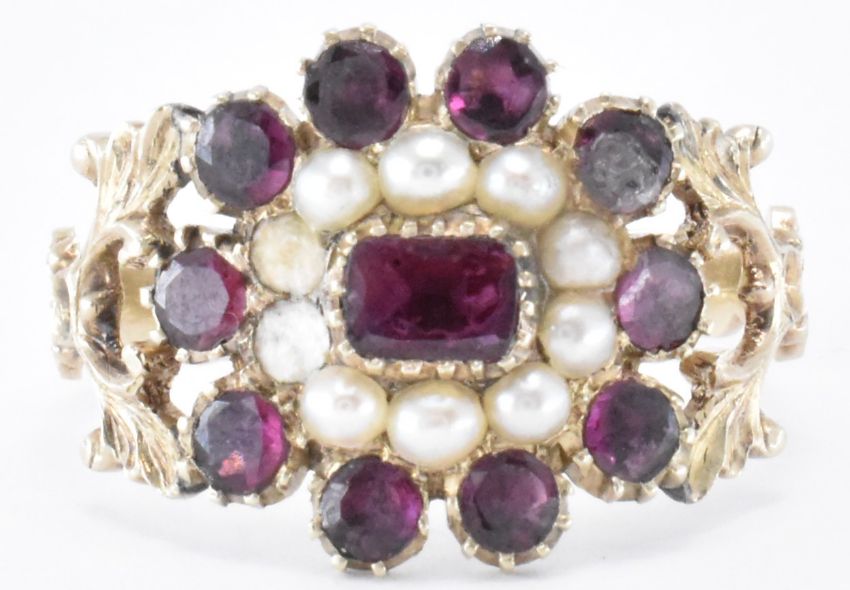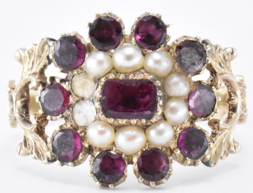 An early 19th Century George III gold, garnet and seed pearl ring. The ring having a central rectangular garnet with a halo of half pearls surrounding it, and further row of round cut garnets. The head set within pierced foliate shoulders with a reeded band. Principle stone measures 3.4 x 4.5mm. Weight 2.4g. Size P.5. Two pearls missing. Unmarked, tests indicate 9ct gold.