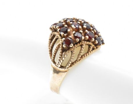 A vintage 9ct gold and garnet dome ring. The ring being set with 22 round cut garnets within a pierced mount with rope twist detailing. Unmarked but tests indicate 9ct gold. Weight 6.8g. Size R. 23rd stone missing but present.