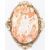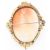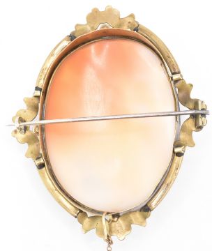 A 19th Century Victorian carved conch shell cameo brooch. The brooch having an oval panel depicting a courting couple set within a gold plated decorative mount with moulded bows and incised detailing. Unmarked. Measures 6.4 x 5.4 cm.