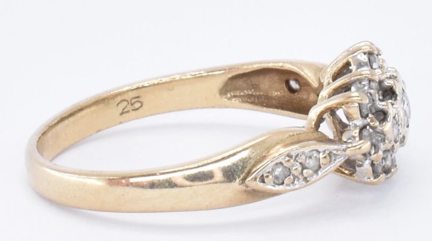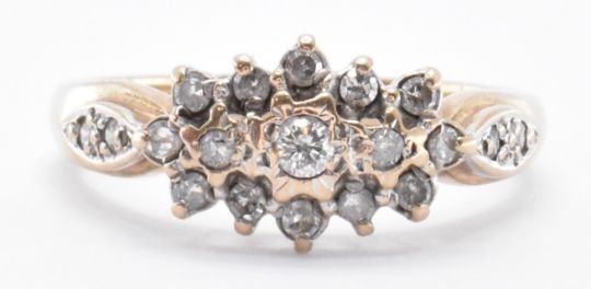 A hallmarked 9ct gold and diamond ring having cluster of diamonds to the head with further accent stones to the shoulders. Assay marked Sheffield, sponsors mark TAD. Weight 2.39g. Size N.