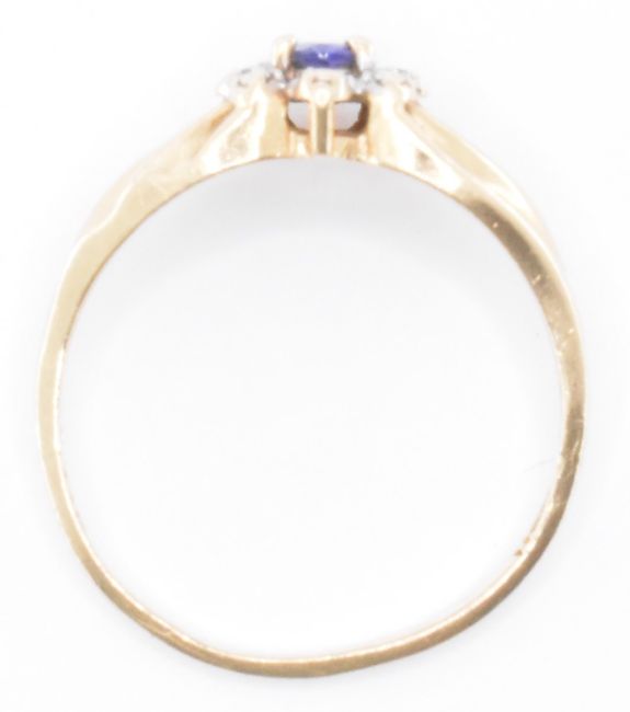 A 14ct gold aquamarine and diamond ring. The ring being set with a central oval cut aquamarine with a halo of round cut diamonds with reeded shoulders and a plain band. Marked 14k, tests indicate 14ct gold. Weight 2.17g Size L.5.