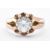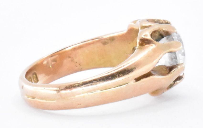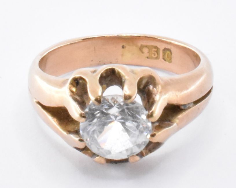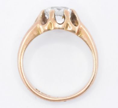 A 19th century 15ct gold ring. The ring set with a white stone, within a claw setting, to bifurcated shoulders to double shank. Partial mark to shank. Tests indicate 15ct gold. Weight 5.1g. Size I. (Note white stone is a later simulant, used as a replacement for a diamond).
