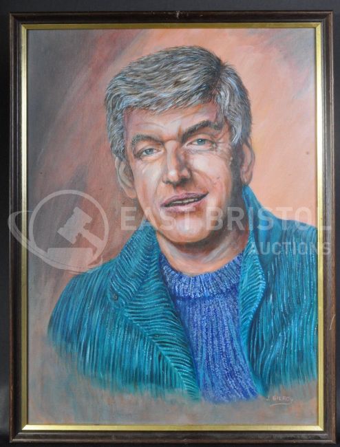 Estate of Dave Prowse - John Gilroy (British, 20th Century) - acrylic on board painting of Prowse in a head and shoulders pose. Signed to the corner by the artist. As hung in Prowse's home for some years. Framed and glazed to a total size of: 64cm x 49cm.