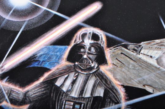 Estate of Dave Prowse - Star Wars - Fan Artwork - an artwork print featuring a montage of ships, with Luke Skywalker and Darth Vader. Signed ' Masa ' to corner in silver ink. Unframed. Total size: 42cm x 30cm.