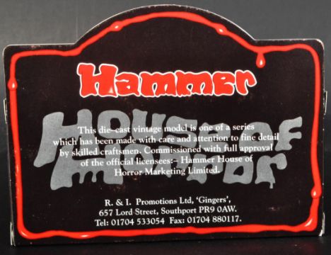Estate of Dave Prowse - Lledo Promotors - One of Prowse's own ' Hammer House Of Horror ' Lledo diecast models, featuring artwork to the vehicle for the classic horror franchise. The certificate has been signed to the rear by Prowse in blue ink.