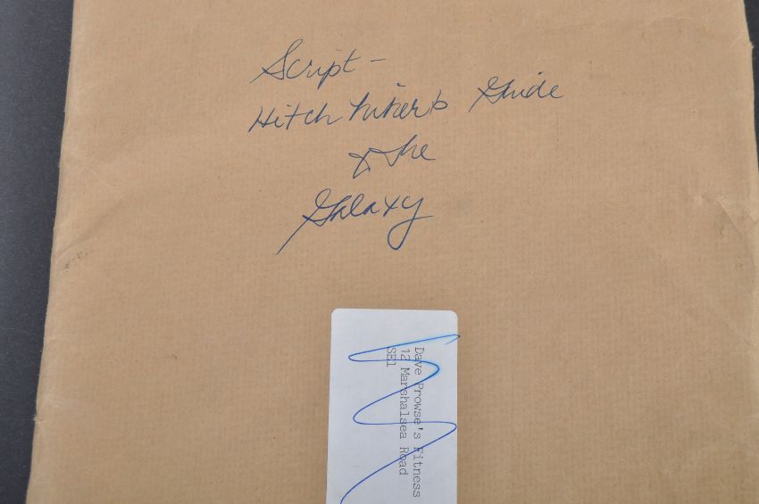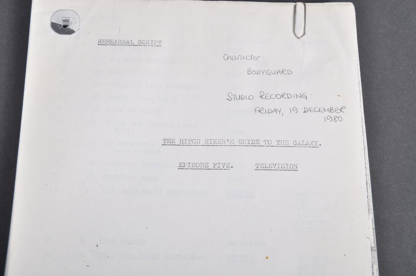 Estate of Dave Prowse - The Hitch Hiker's Guide To The Galaxy - Mr Prowse's personal original rehearsal script for the sci-fi classic - Series 1 Episode 5 - in which Prowse played the part of a Bodyguard. The script is complete and runs to 97pp, and retains its original pinto corner. Prowse's character is noted to the cover, along with the studio recording date of 19th December 1980. The script retains its original envelope which was sent to Dave Prowse's Fitness Centres, London and has written upon it ' Script - Hitchhiker's Guide To The Galaxy ' in Prowse's hand. Unique piece of memorabilia from the classic BBC programme.