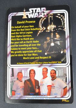 Estate of Dave Prowse - a 501st Legion ' Red Stick Rebellion Collectors Club ' custom Kenner type carded MOC action figure ' David Prowse - Darth Vader '. Featuring a standard Kenner Vader action figure, mounted on a custom card back featuring an image of Prowse to the front. Typed message to the reverse. Unique fan-gifted item from Prowse's estate.