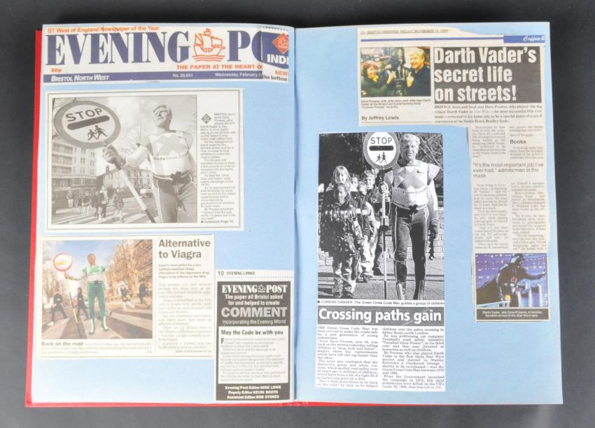 Estate of Dave Prowse - Mr Prowse's personal ' Cuttings Book ' filled with newspaper clippings c1999-2001 featuring Prowse, or his relevant work. Includes several high profile interviews in national newspapers, clippings related to his work as the Green Cross Man and others. Many photographs also included from various publications. A unique item from his estate.