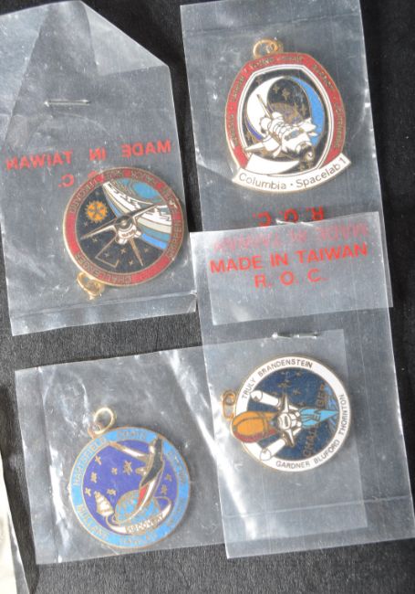 Estate of Dave Prowse - Space Travel - a collection of x12 commemorative space related charms / plaques. Gold plated, with enamel decoration. Five mounted to letters addressed to Mrs Prowse from E. W. Nicks - charms for seventh flight of Columbia, Mission 51-L loss of the Space Shuttle Challenger, launch and landing of Atlantis, and others. All in original wrapping, unopened.