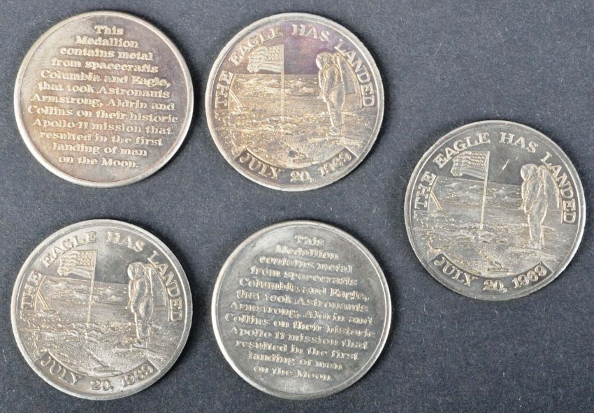 Estate of Dave Prowse - Space Travel - a collection of x5 ' The Eagle Has Landed ' Apollo 11 related medallions, containing metal flown on Columbia and Eagle which took man to the moon. Each featuring text to reverse, and an image of the moon's surface to front. Prowse had a keen interest in Space and Space Travel.