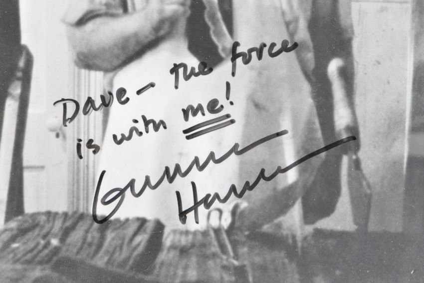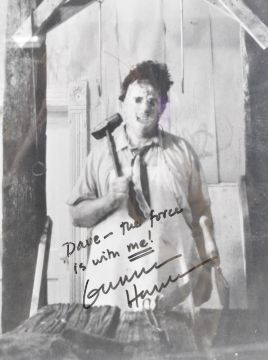 Estate of Dave Prowse - Gunnar Hansen (1947-2015) - Texas Chainsaw Massacre - autographed 8x10" black and white photograph of Hansen as Leatherface. Signed in black ink ' Dave - The Force Is With ME! '. Framed and glazed. Originally displayed by Prowse in his Star Gym. Measures approx; 27cm x 22cm.