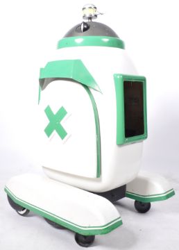 Estate of Dave Prowse - The Green Cross Code Man - an icon of 1970s television - the original production used ' Droid ' robot from the famous Green Cross Code adverts which featured Mr Prowse as The Green Cross Man. Droid comes in full working order, benefitting from recent servicing and maintenance. Moving head, and light-up chest section, and fitted with a Bluetooth speaker to front. White fibreglass body, with green ancillaries with a motorised wheeled base. Radio controlled, with largely new electrics. Full working order, supplied with a battery charger. Measures approx; 130cm tall. A unique piece of British television history, with several key links to Star Wars.