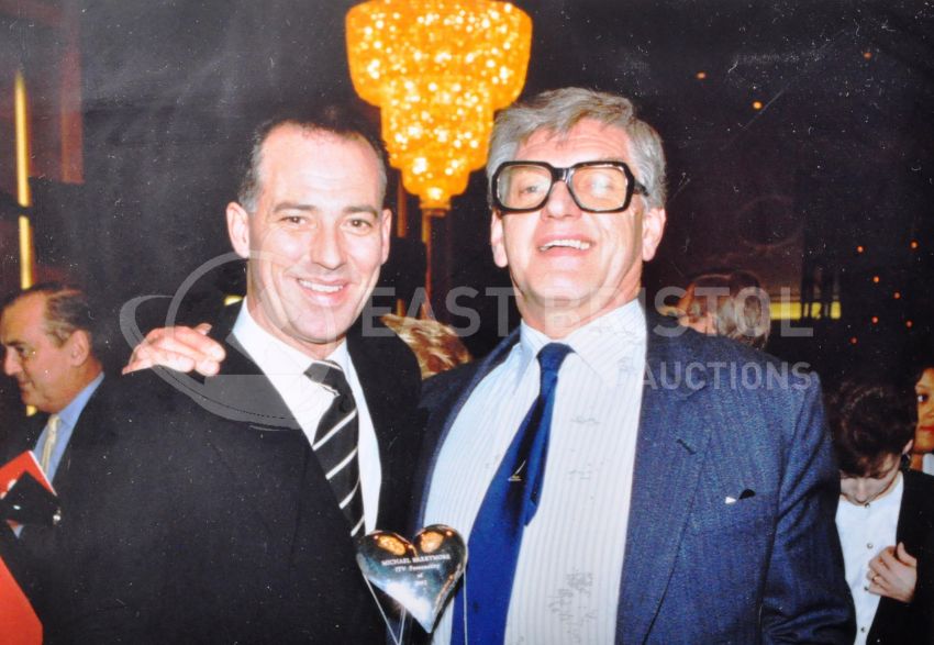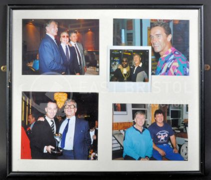 Estate of Dave Prowse - Star Gym - a framed presentation of personal photographs of Prowse alongside various celebrities, all from his personal collection. Includes; Arnold Schwarzenegger, Mr T (a polaroid of Mr T and Prowse together), Michael Barrymore and others. Framed. Originally hung on the wall of Prowse's Star Gym. Total size approx; 39cm x 45cm.