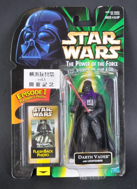 Estate of Dave Prowse - Star Wars - Mr Prowse's personally owned custom Kenner made Power Of The Force Darth Vader MOC carded action figure (1990s). Japanese issue on green / black cardback, with an over-sticker to the reverse reading ' Masa Kuroki Original Star Wars Art ', signed by Masa. The figure sealed, contents unopened and mint. Some light wear to the card.