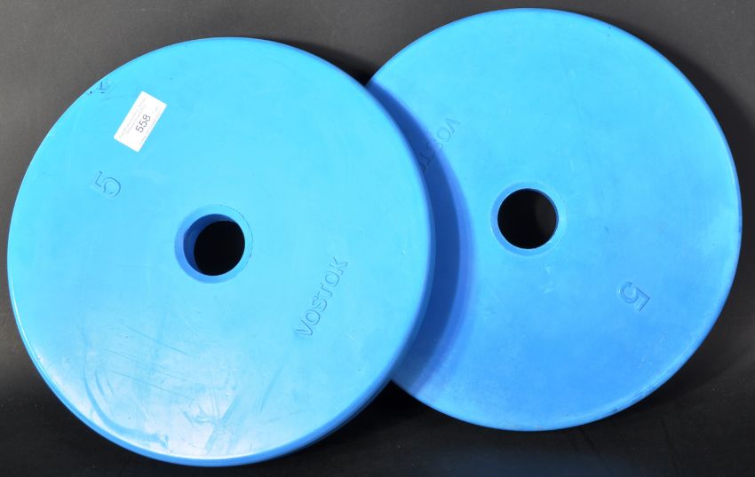 Estate of Dave Prowse - Bodybuilding / Fitness - x2 of Prowse's personally used weightlifting weights. By Vostok, both marked ' 5 ', in blue. Used by Prowse in his Star Gym. 'The weights that built Darth Vader'. Each measures approx; 30cm diameter.