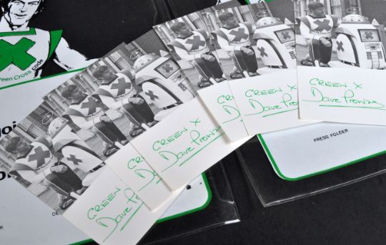 Estate of Dave Prowse - Green Cross Code - a collection of original vintage 1970s promotional material, all belonging to Prowse - comprising; x2 Green Cross Man plastic wallets / folders, x6 promotional images with printed autographs ' A Word From Green Cross Man & Droid ' cards, and an original Green Cross Code pin badge. Prowse's personal memorabilia.