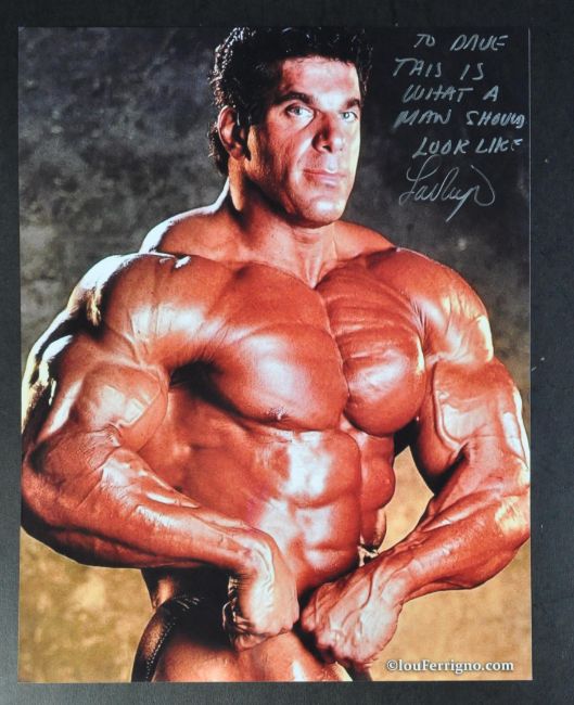 Estate of Dave Prowse - Lou Ferrigno - an autographed 8x10" colour promotional photograph. Signed by Ferrigno in silver ink and dedicated ' To Dave - This Is What A Man Should Look Like '. Ferrigno is perhaps best known for his portrayal of The Incredible Hulk and was a good friend of Mr Prowse.