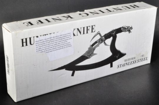 Estate of Dave Prowse - a contemporary gothic fantasy style display knife. Shaped blade, with pictorial decoration, and a gothic style leather wrapped, hilt with dragon decoration. Appears opened, but undisplayed. Knife length approx; 40cm.