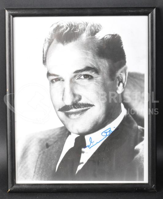 Estate of Dave Prowse - Vincent Price (1911-1993) - autographed 8x10" black and white photograph of Price in a head and shoulders pose. Signed neatly in blue ink to a clear area of the image. Late autograph. Undedicated. Obtained personally by Prowse, and displayed in his Star Gym. Framed and glazed.