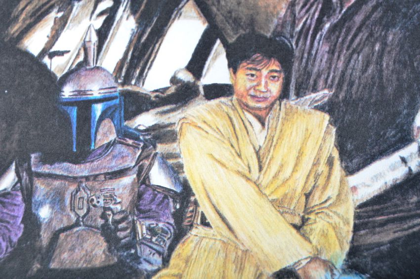 Estate of Dave Prowse - Star Wars - Fan Artwork - an artwork print featuring a montage of characters from the franchise. Likely the artist to centre depicted as Luke Skywalker. Signed ' Masa ' to corner in silver ink. Unframed. Total size: 26cm x 36cm.