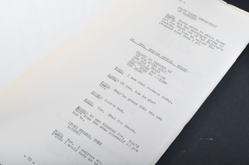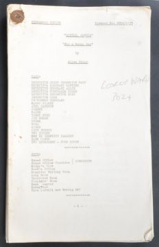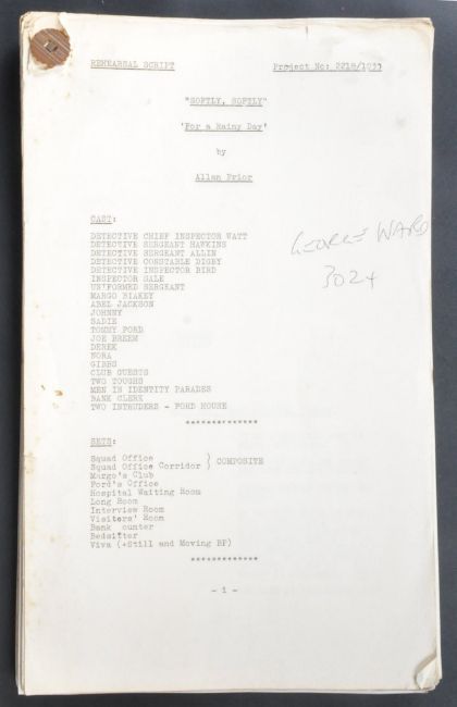 Estate of Dave Prowse - Softly Softly (1960s BBC Police series) - For A Rainy Day - Prowse's original production Rehearsal Script for the episode in which he played Johnny. 79pp (possibly missing the final page), with original pin to corner. A few annotations, but largely unannotated. Scripts from the series are seldom seen.