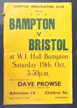 Estate of Dave Prowse - Bodybuilding - an original ' Bampton V Bristol ' weightlifting / bodybuilding contest event poster, c1960s. Printed by Rose, Carterton. Location text to centre and ' Personal Appearance Of Dave Prowse ' to the lower section. Yellow stock, with green and black text. Folded. Measures approx 38cm x 25cm.